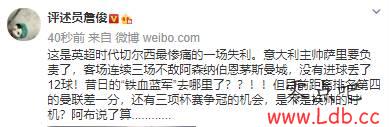 詹俊在写道:“这是英超时代切尔西最惨痛的一场失利。意大利主帅萨里要负责了,客场连续三场不敌阿森纳伯恩茅斯曼城,没有进球丢了12球!昔日的“铁血蓝军”去哪里了??!!但目前距离排名第四的曼联差一分,还有三项杯赛争冠的机会,是不是换帅的时机?阿布说了算............ ????”