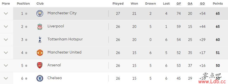 英超直播吧2月11日讯英超第26轮,切尔西客场0-6惨负于曼城,这场比赛的结果也帮了竞争对手阿森纳一把,枪手目前凭借进球数优势升至了联赛第5