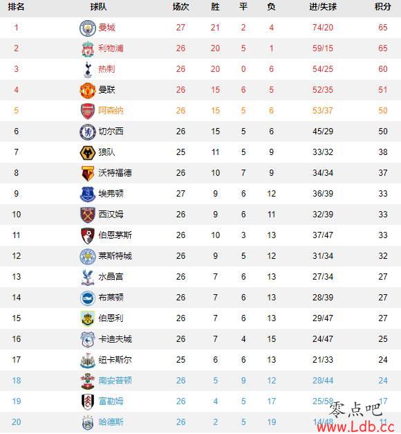 曼城与利物浦同积65分,多赛一场的曼城以净胜球优势占据榜首,利物浦位居次席,热刺积60分排名第三,曼联积51分重返欧冠区,阿森纳和本轮惨败的切尔西同积50分,分列五六位。