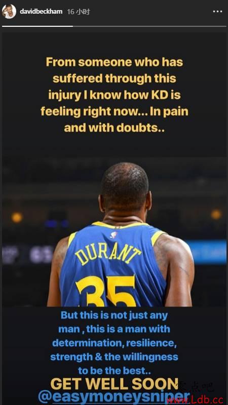 曾经同样遭受跟腱伤病的贝克汉姆表示:“对于曾经同样遭遇这种伤病的人来说,我知道此时此刻KD的感受,带着疑虑倍感伤痛。”