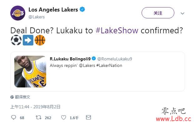 英超直播吧8月3日讯 此前洛杉矶湖人队官推转发了卢卡库穿湖人球衣的照片,并开玩笑地写道:“交易完成?卢卡库加盟湖人确认?”