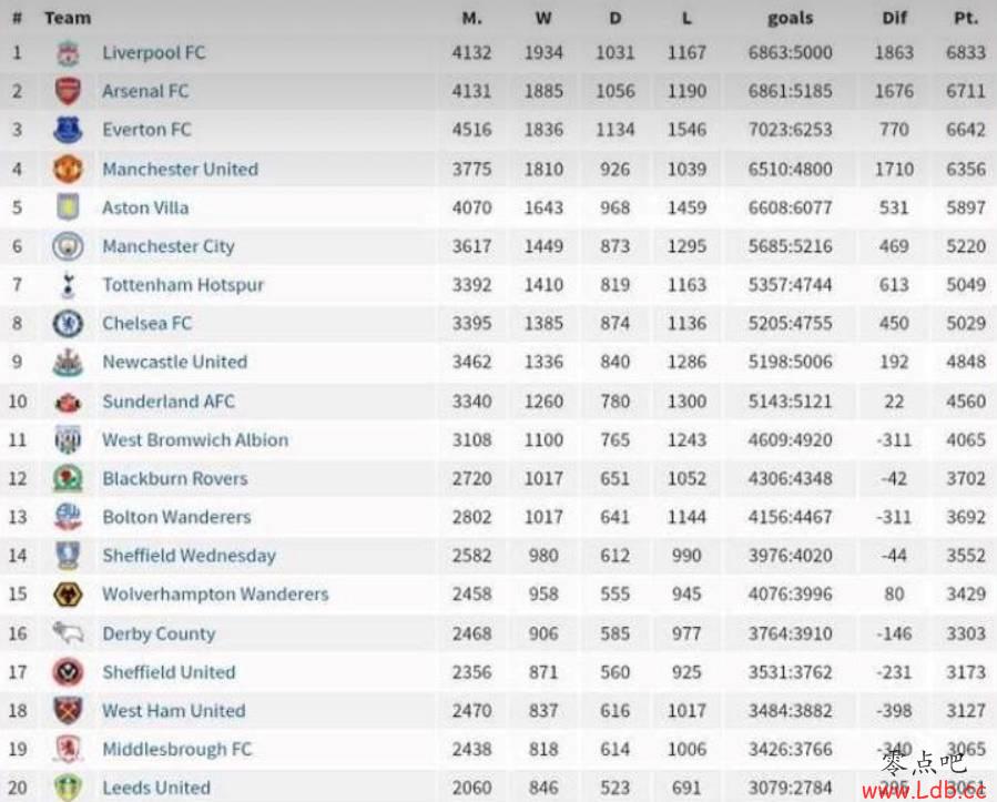 英超直播吧8月4日讯 英超联赛即将战火重燃,数据统计显示利物浦是英格兰顶级联赛积分最高的球队,达到了6833分