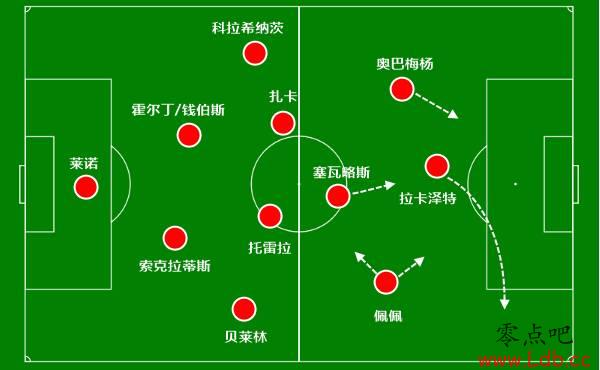 球队的另外一个选择,就是用塞巴略斯来取代厄齐尔,作为中场的关键组织者和进攻发起点。与此同时,N-佩佩也会获得更多的拿球机会和控球权。当拉卡泽特在锋线上突然拉边的时候,无论是塞巴略斯、佩佩,还是奥巴梅扬,都将获得内收中路攻击的机会。