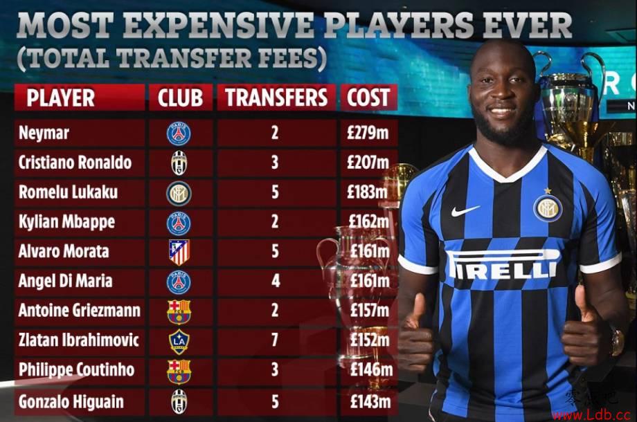 球员累积转会费:内马尔第一,C罗第二,卢卡库升至第三