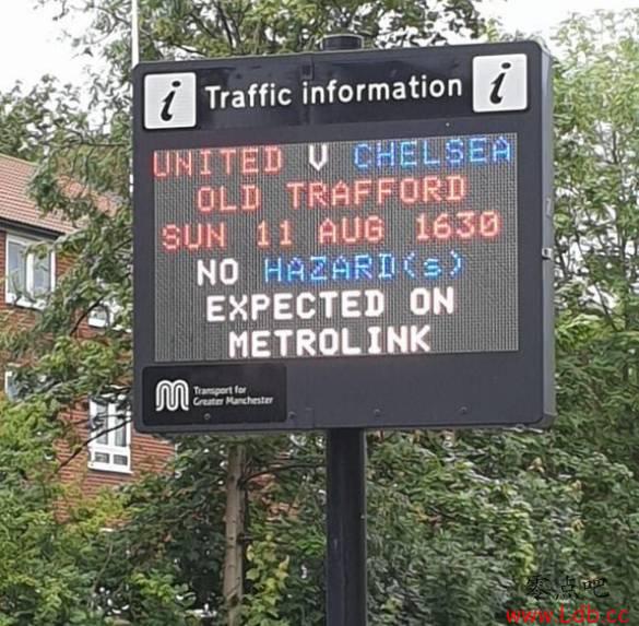 英超直播吧8月10日讯 本周新赛季英超将正式拉开帷幕,周日晚23:30曼联将在首轮比赛中主场对阵切尔西。赛前,曼彻斯特交通局再次玩起了文字梗,没有阿扎尔。
