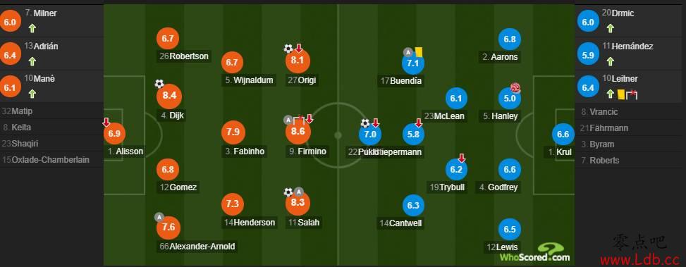 利物浦首发:阿利森6.9、阿诺德7.6、戈麦斯6.8、范迪克8.4、罗伯逊6.7、法比尼奥7.9、亨德森7.3、维纳尔杜姆6.7、奥里吉8.1、萨拉赫8.3、菲尔米诺8.6