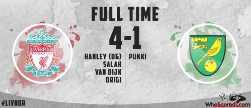 2019-20赛季英超揭幕战,利物浦在主场安菲尔德迎战诺维奇。上半场比赛,汉利送乌龙大礼,萨拉赫进球,范迪克与奥里吉分别头球建功,利物浦4-0大比分领先;下半场比赛,普基为诺维奇扳回一分。最终,利物浦主场4-1战胜诺维奇,获得新赛季开门红。