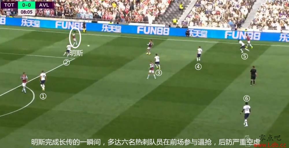 我们来看麦克金的进球。但在这之前,中卫明斯的助攻才是问题的关键所在。除了一脚足够漂亮的长传之外,我们来看热刺前场堆砌了多少队员来进行压迫。多达6名热刺队员压上在对方半场,明斯的长传就足够拉开所有人的身位,麦克金心神领会的插上帮助维拉打入回归英超的首球。