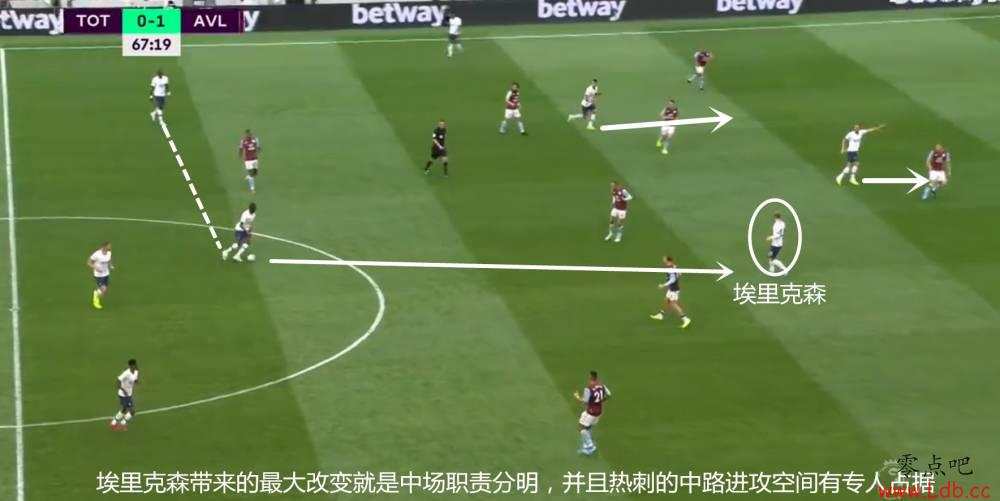 埃里克森的登场不仅是为双后腰身前的位置留出了足够的空间,更是将中场职责分化得十分细致之后,热刺的进攻一下子就变成了有源头的活水,而不是上半场中场毫不设防被维拉用反击压制时的状态,埃里克森作为一名超级球星的梳理作用彰显得淋漓尽致,而且能够为热刺的中前场进攻直接提速,更是有着直接为球队带来进球的能力,相信这也是各大顶级豪门对其垂涎欲滴的理由。