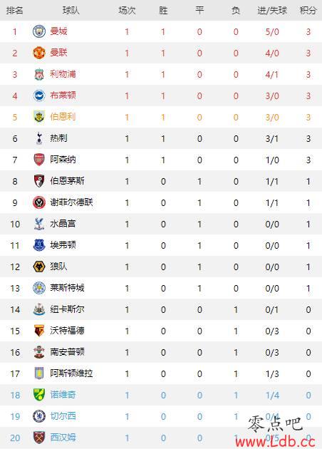 英超首轮过后积分榜情况↓