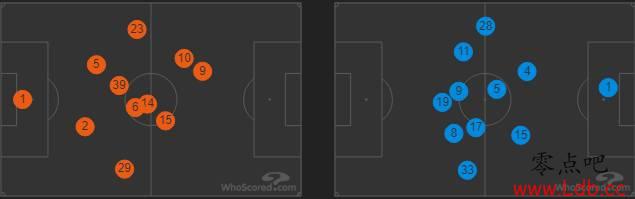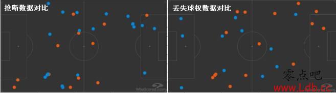 通过上图我们可以清晰地看到,曼联上半场比赛一共完成了12次抢断,只有4次在对方半场;切尔西完成了19次抢断,在对方半场完成了11次;而从丢失球权的数据来看,曼联在本方半场丢失球权8次,切尔西为4次。