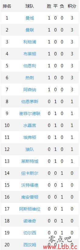 曼城、曼联、利物浦、布莱顿、伯恩利、热刺和阿森纳同积3分,曼城以净胜球优势位居榜首。