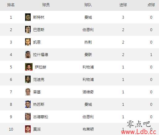 斯特林首轮比赛上演帽子戏法,以3粒进球位居榜首,巴恩斯、凯恩和拉什福德梅开二度紧随其后。