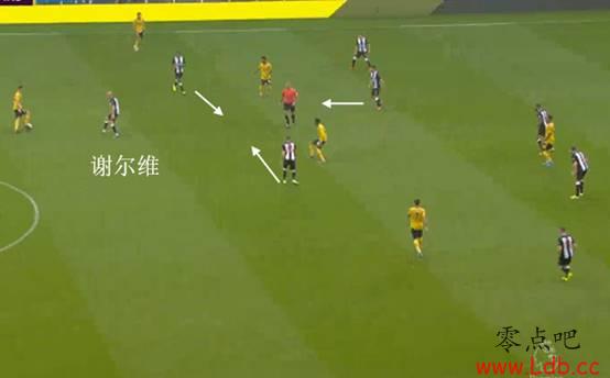 以上图双方攻防为例。谢尔维前顶时,身后的海登和朗斯塔夫立刻收过来填补空缺,同时右边中卫舍尔前压。这样一来纽卡就在局部对尼尔森和威洛克形成三人合围之势。而曼基略在靠后的位置,进可兑掉助攻上来的蒙雷亚尔,退可内收保护舍尔身后的空当。阿森纳肋部渗透的难度直线上升。