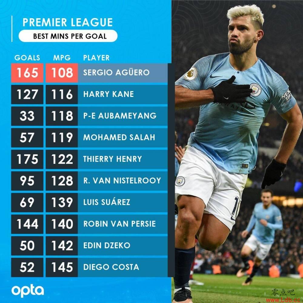 英超球员历史进球效率榜:阿圭罗每108分钟1球居首