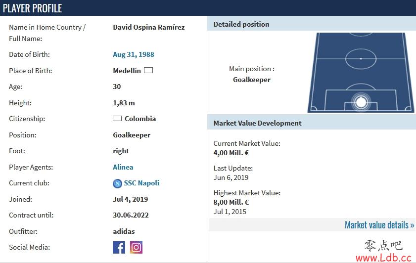 英超直播吧8月15日讯 据德国转会市场网消息,哥伦比亚门将奥斯皮纳与那不勒斯签下了一份三年合同,双方签约至2022年6月30日