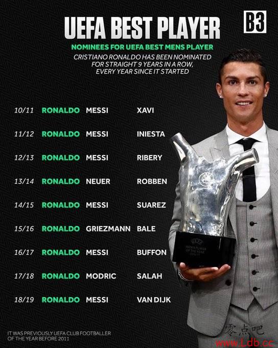 C罗是历史上唯一一个连续9个赛季进入欧足联最佳球员前三的