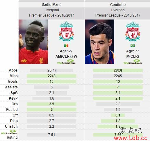 那一年马内与库蒂尼奥的进球都是13个,但场均射门几乎只有队友的三分之二。马内在让出开火权的同时还能保证效率是相当不易的。