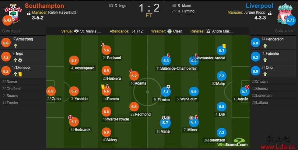南安普顿VS利物浦评分:马内8.7分全场最佳