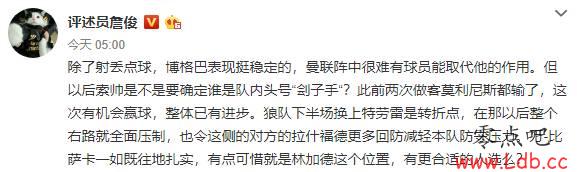 詹俊写道:“除了射丢点球,博格巴表现挺稳定的,曼联阵中很难有球员能取代他的作用。但以后索帅是不是要确定谁是队内头号“刽子手“?此前两次做客莫利尼斯都输了,这次有机会赢球,整体已有进步。”