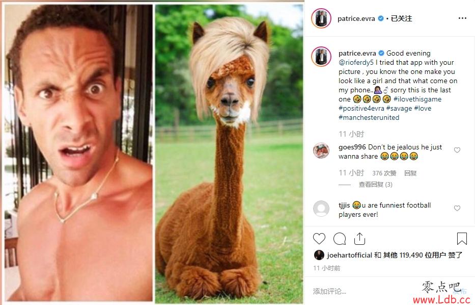 英超直播吧8月24日讯 近日,前曼联后卫埃弗拉在社交媒体上调侃了前队友费迪南德的自拍照,他将费迪南德的自拍与PS后加了头发的羊驼放在了一起