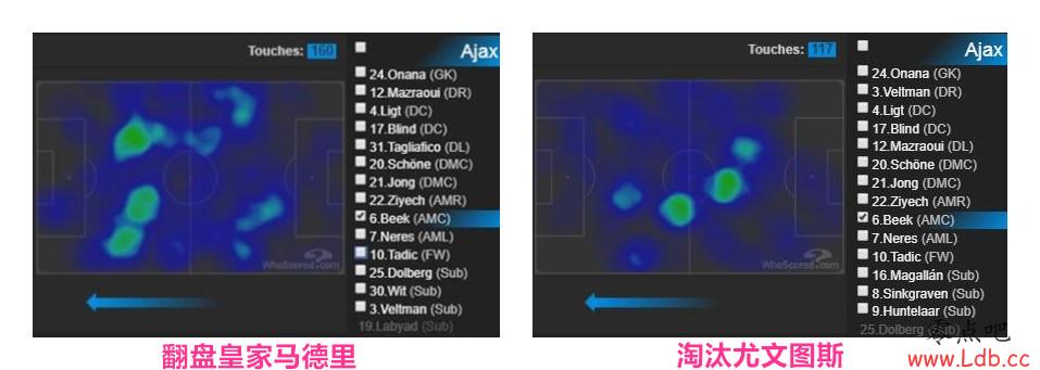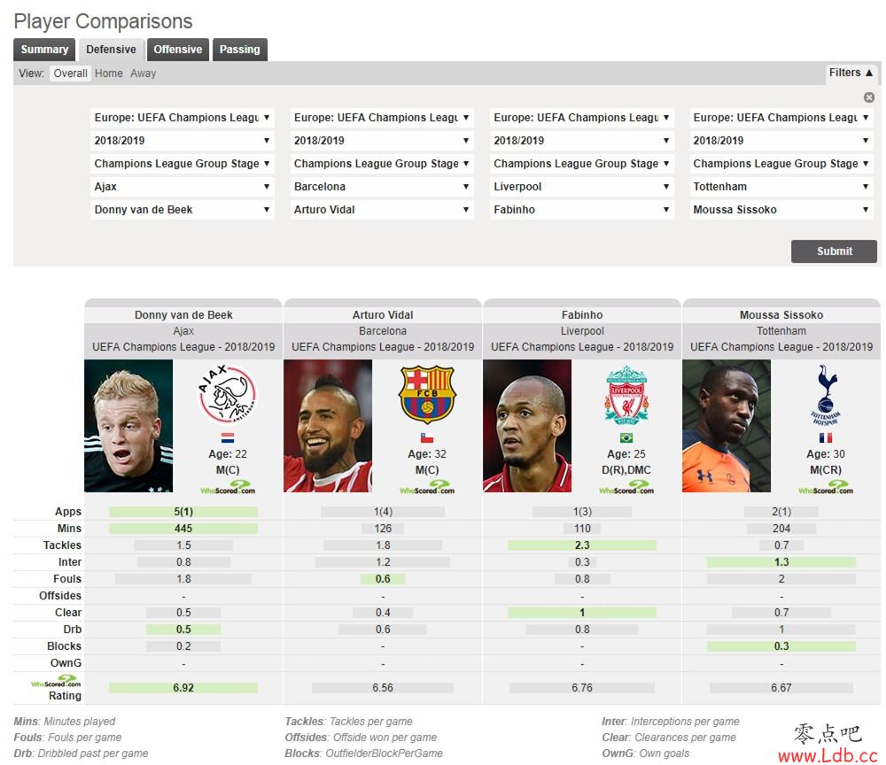 或许又有人会说,覆盖面只能说明体能好,并不能说明防守。于是,我们在whoscored上对比了范德贝克和欧冠另外三强后腰的数据,范德贝克超高的前场断球率和前场协防意识,都是阿贾克斯“快打旋风”中的重要一环。在仅仅罗列欧冠范围的防守数据中,范德贝克丝毫不亚于法比尼奥、比达尔、西索科。场均防守得分的6.92也是要高于另外三人,或许有人会说阿贾克斯的高位逼抢战术可以大幅提升他的数据,但也侧面说明了他的后腰功底。