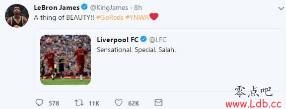 詹姆斯转发了这条推特,配文写道:“美妙#加油红军#YNWA”。