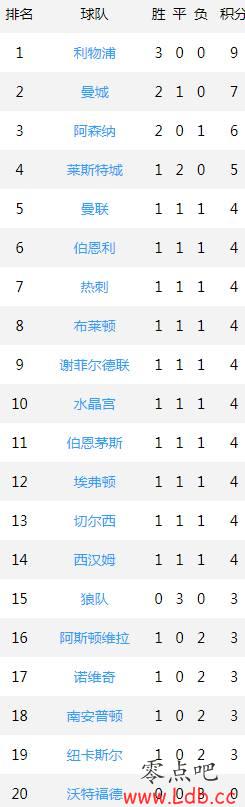 利物浦三战全胜独占榜首,曼城2胜1平积7分位居次席,阿森纳和莱斯特城分列三四位。曼联、切尔西、热刺等多队同积4分。