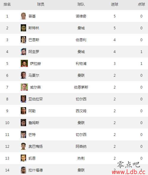 普基和斯特林同进5球,巴恩斯和阿圭罗斩获4粒进球,萨拉赫则有3球入账。