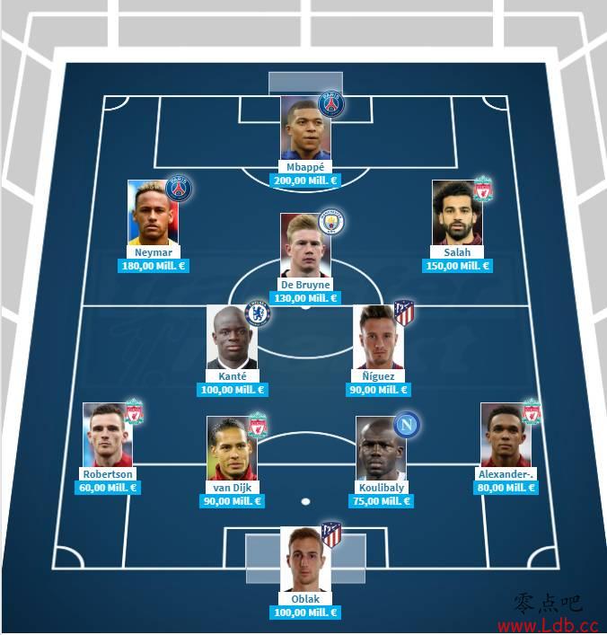 德转盘点欧冠最贵阵:姆巴佩2亿欧领衔 利物浦四将入选