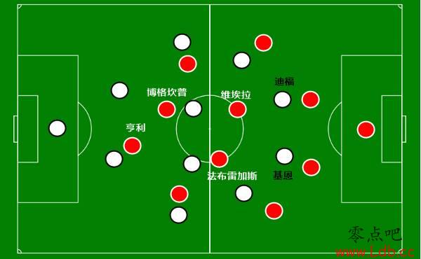 从模拟战术板可以看到,两支球队都是使用442阵型。相对来说,阿森纳方面利用博格坎普回撤拿球,亨利站位更加突前,有些类似于4411。不过两翼的永贝里、雷耶斯和下半场替补出场的皮雷都具备很强的攻击力,通过中场的连续传递和团队推进制造机会。