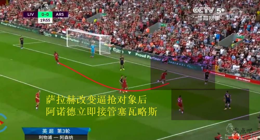 塞巴略斯 将球分给蒙雷亚尔后,萨拉赫跟着球去抢蒙雷亚尔,这样塞巴略斯就被放空了。如果阿诺德不上去逼抢,那么萨拉赫等于是1防2,对手遛猴也给他遛死了;但阿诺德上去就不一样了,刚才的3-4-3就在某种意义上变成了3-3-4,阿诺德把边路的塞巴略斯给接管过来了。这里仍旧是典型的1对1盯人而非围抢,其实真正直接给持球人压迫的,就一个阿诺德。