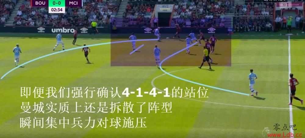 确实,我们能够依稀看出曼城的4-1-4-1站位,这其中阿圭罗并没有出现在镜头里。但问题是,你很难说这是刻意保持阵型的结果,与其说曼城刚开始就奉行一个4-1-4-1的平行站位防守倒不如说因为防守开始时球员所处位置原因,进行围抢后自动站成了这么个阵型。其实曼城防守的目的非常明显,就是围绕持球人屯集重兵,直接切断所有出球线路。注意阴影区域内集中了曼城多少人?这其实才是真正的“围抢”。