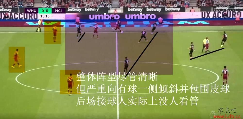 姑且算比较清晰的4-2-3-1站位吧,但这个阵型其实对整体站位而言没有太大意义,充其量我们只能说,此时后卫线是完整的,其余部分则随时可以彻底拆散。曼城在狭小的阴影区域内集中了4人,用意“昭然若揭”,就是冲着持球人去的。而橙色阴影区域内的3名西汉姆后卫,几乎完全没人盯防。足见曼城对持球人重视到了何种程度,对接应人忽视到了何种程度。