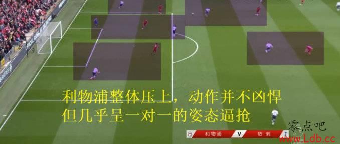 坦白讲高位逼抢的动图很难直观反映出具体信息,不仔细盯着看好几遍,是不大能从整体站位上窥测思路的。但我们可以通过静态图,把利物浦逼抢的特点尽可能给说的明白些: