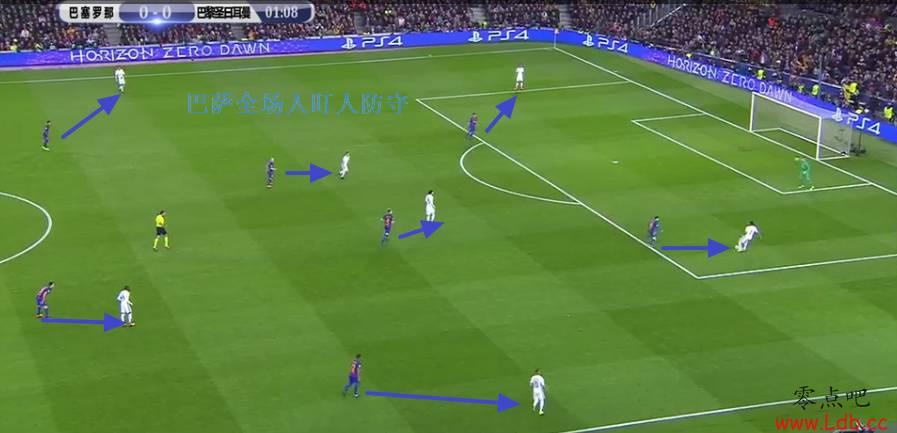 上图是进攻发起阶段巴萨的防守站位,非常标准的1对1盯人。