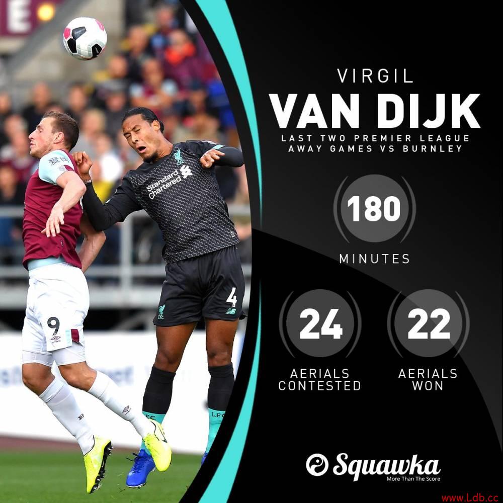 上一次做客摩亚球场,范迪克在13次争顶高空球时赢下12次,近两次做客伯恩利,范迪克24次空中对决赢下22次。