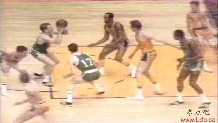 转换进攻的时候比尔-拉塞尔在内线很深的位置拿到球,面对梅尔-康茨的防守勾手不中。