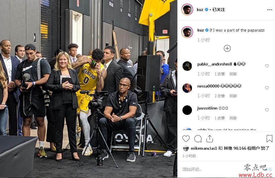 零点吧9月28日讯 今日湖人众多球员亮相新赛季媒体日。前锋凯尔-库兹马更新了个人社媒晒出一张他混到现场记者之中拍摄队友的趣图。