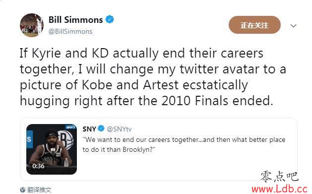 对此比尔-西蒙斯表示:“如果欧文、KD确实能一起结束职业生涯,我会将我的推特头像改成2010年总决赛后科比和阿泰斯特的拥抱图。”