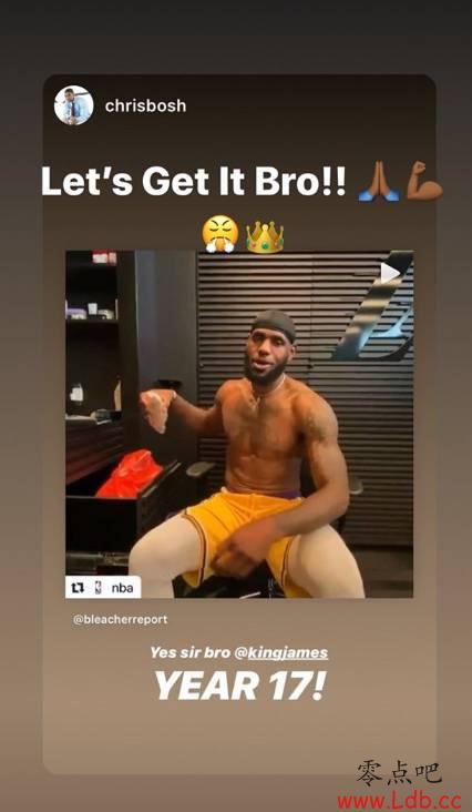 詹姆斯在热火的前队友波什转发并写道:“第17个赛季了,加油我的兄弟!#努力!”