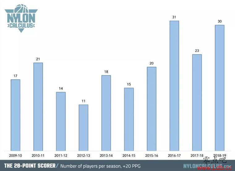 很多球迷非常在意得分这一数据,认为场均可以拿到20+分是一个门槛,能场均得到20+就说明你是明星球员。但是要知道上赛季场均拿到20+的球员是5年前的近两倍,而达到这一门槛的球员数量在过去十年间大部分时候都在稳步增长。