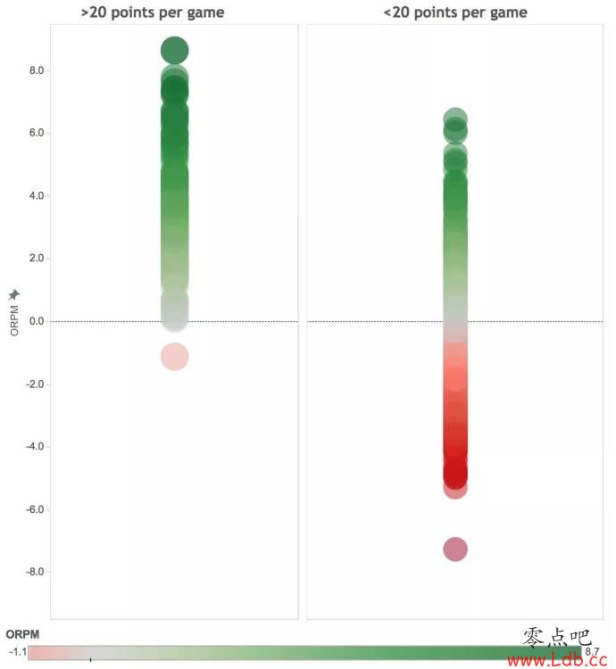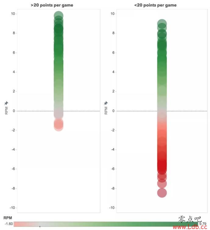 下图显示了自2013-14赛季以来每位出场时间足够的球员个人进攻RPM分布值,其中左侧为场均20+的球员,右侧为场均不足20分的球员。