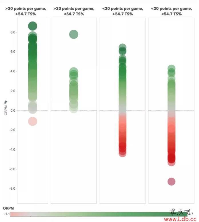我们可以看到,对于真实命中率没能达到54.7%但场均得分20+的球员来说他们的ORPM上限为4,唯一可以超过4的是2014-15赛季的威少。而最右侧场均20+且真实命中率在54.7%以上的球员的ORPM上限达到了8。