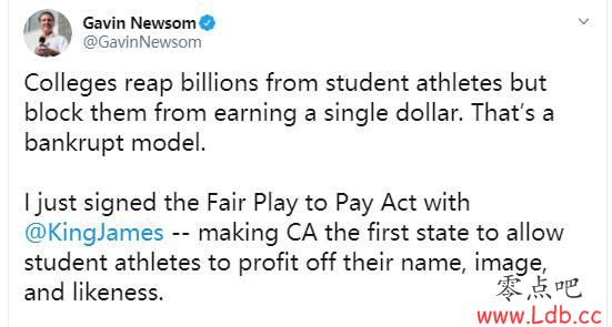 零点吧10月1日讯 今日,加州现任州长Gavin Newsom在个人推特上宣布,与詹姆斯签署协议,使加州成为首个让大学运动员从学校获利的州。原文如下: