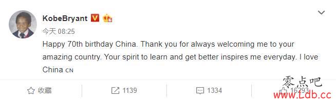 零点吧10月1日讯 在新中国成立70周年华诞之际,NBA名宿科比-布莱恩特也在社交媒体上表达了自己的祝福。