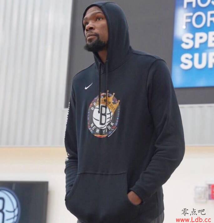 阿杜身穿的连帽衫上印有篮网Logo,而在Logo上这是戴着王冠。