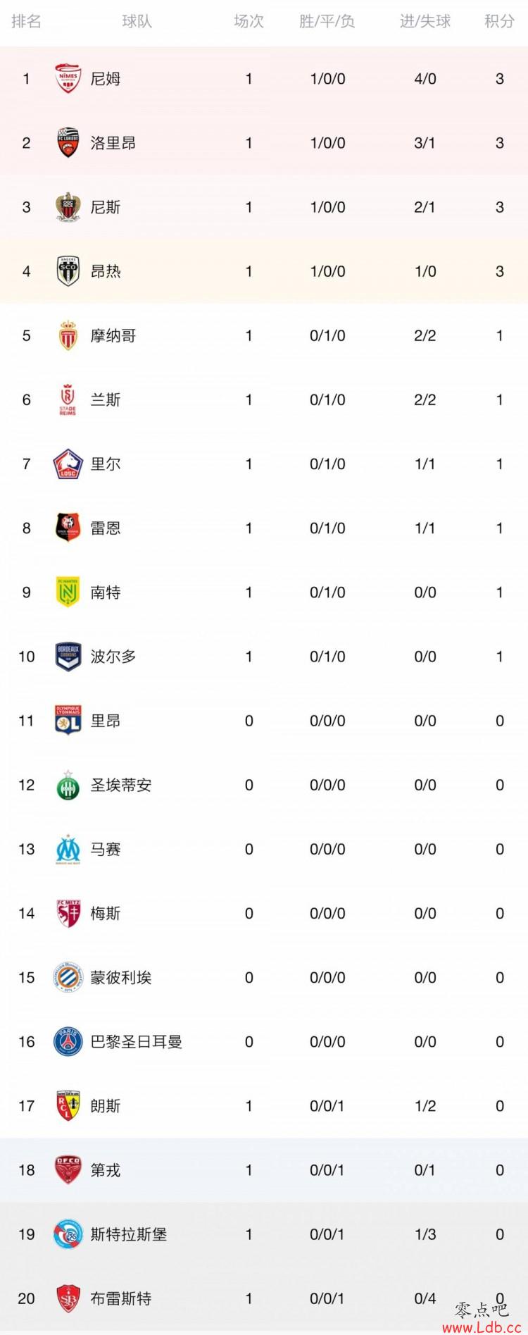 尼姆、洛里昂、尼斯和昂热四支球队首轮获胜,排在积分榜前四位。