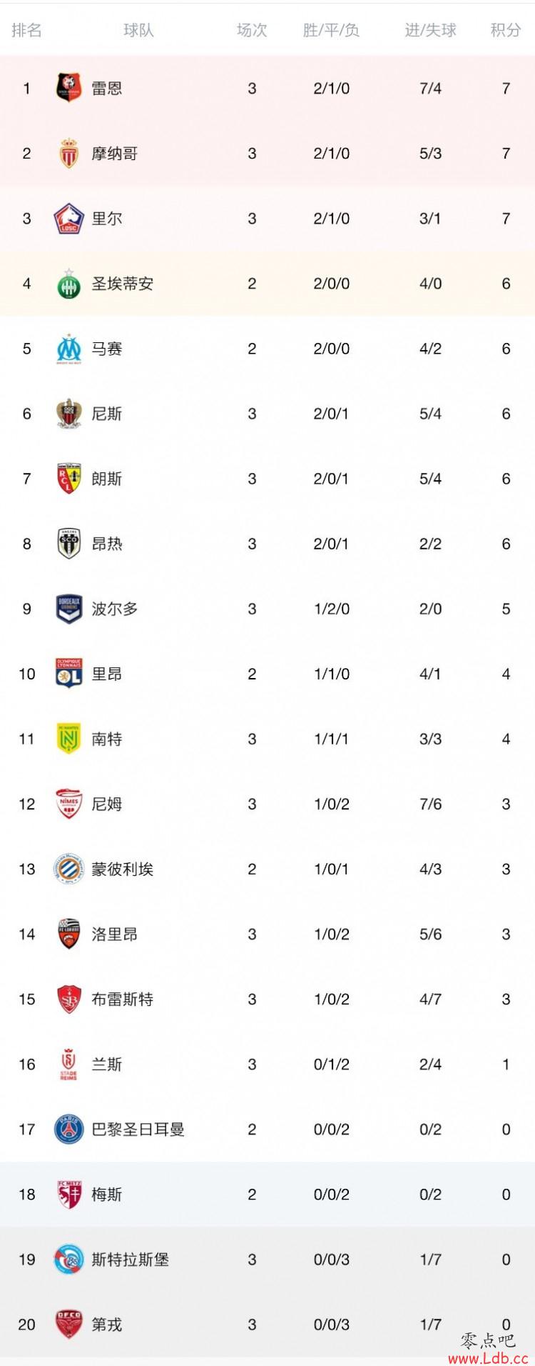 雷恩、摩纳哥和里尔同积7分,占据积分榜前三位,圣埃蒂安、马赛、尼斯、朗斯和昂热积6分,分列四到八位。