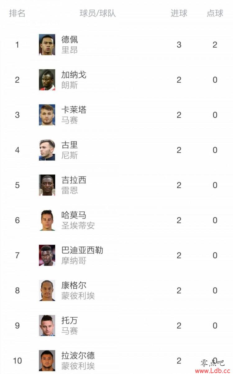德佩以3球领跑,加纳戈、卡莱塔、托万等15名球员斩获2球。